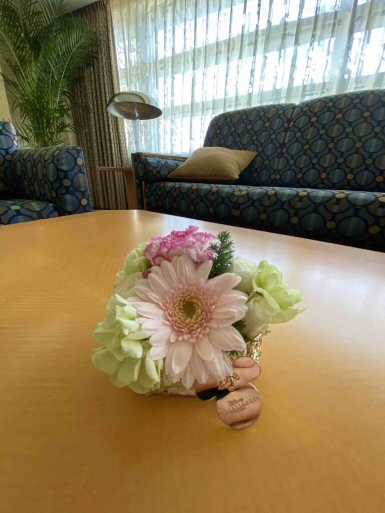 テーブルにはちょこんとお花が。ミッキーチャームがこれまたかわいい♡