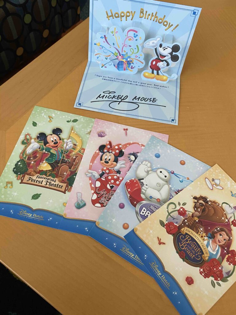 ワークデスクに封筒が置いてあり、そちらにはバースデーカードとかわいいポストカードが♡