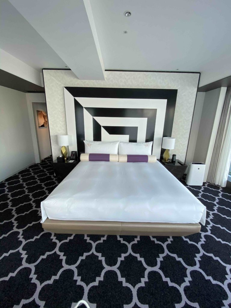 ベッドは広々していて、相変わらずのおしゃれデザイン。