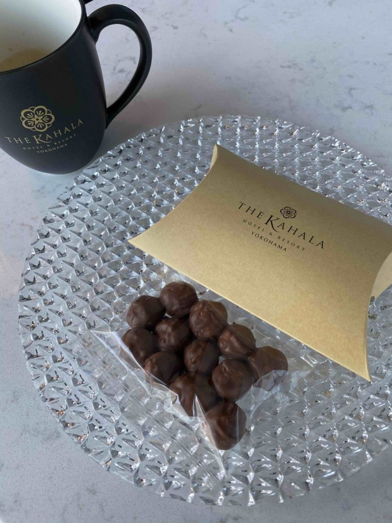 ミニテーブルにはカハラホテル名物のマカデミアチョコレートが置いてあります。