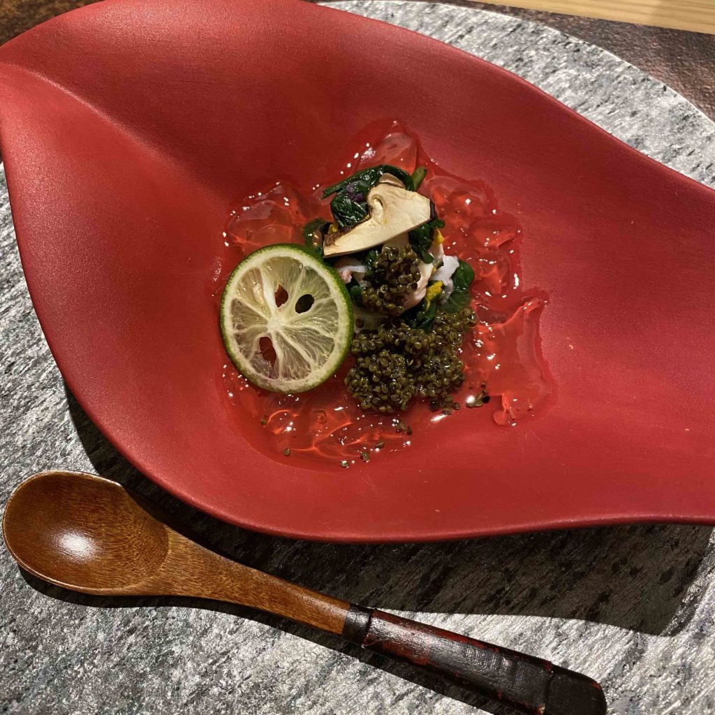 まずは先付。松茸入りの酢橘浸しです。さっぱりとした爽やかなお味。