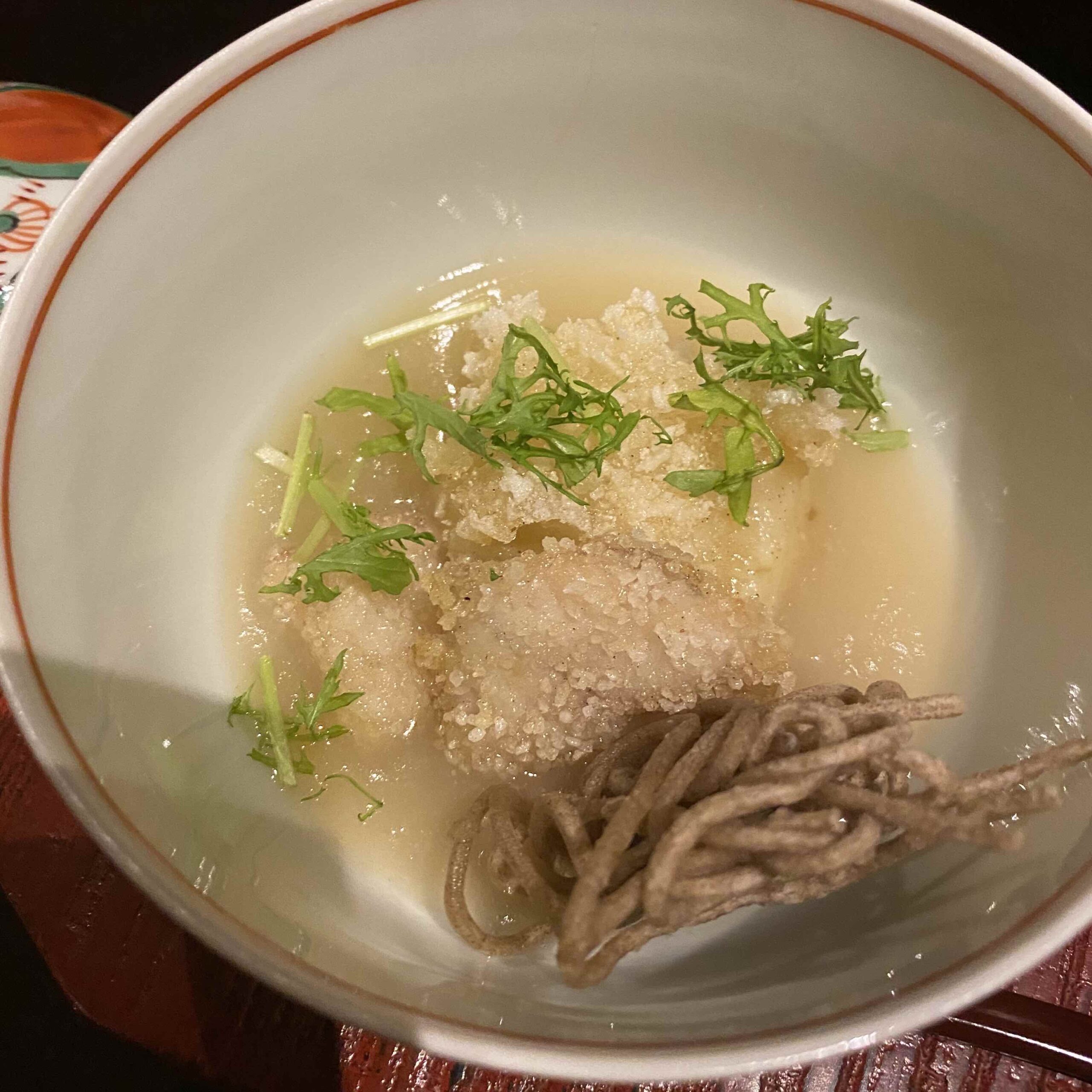 続いてこちらは銀杏豆腐と河豚、蕎麦の揚げ物。