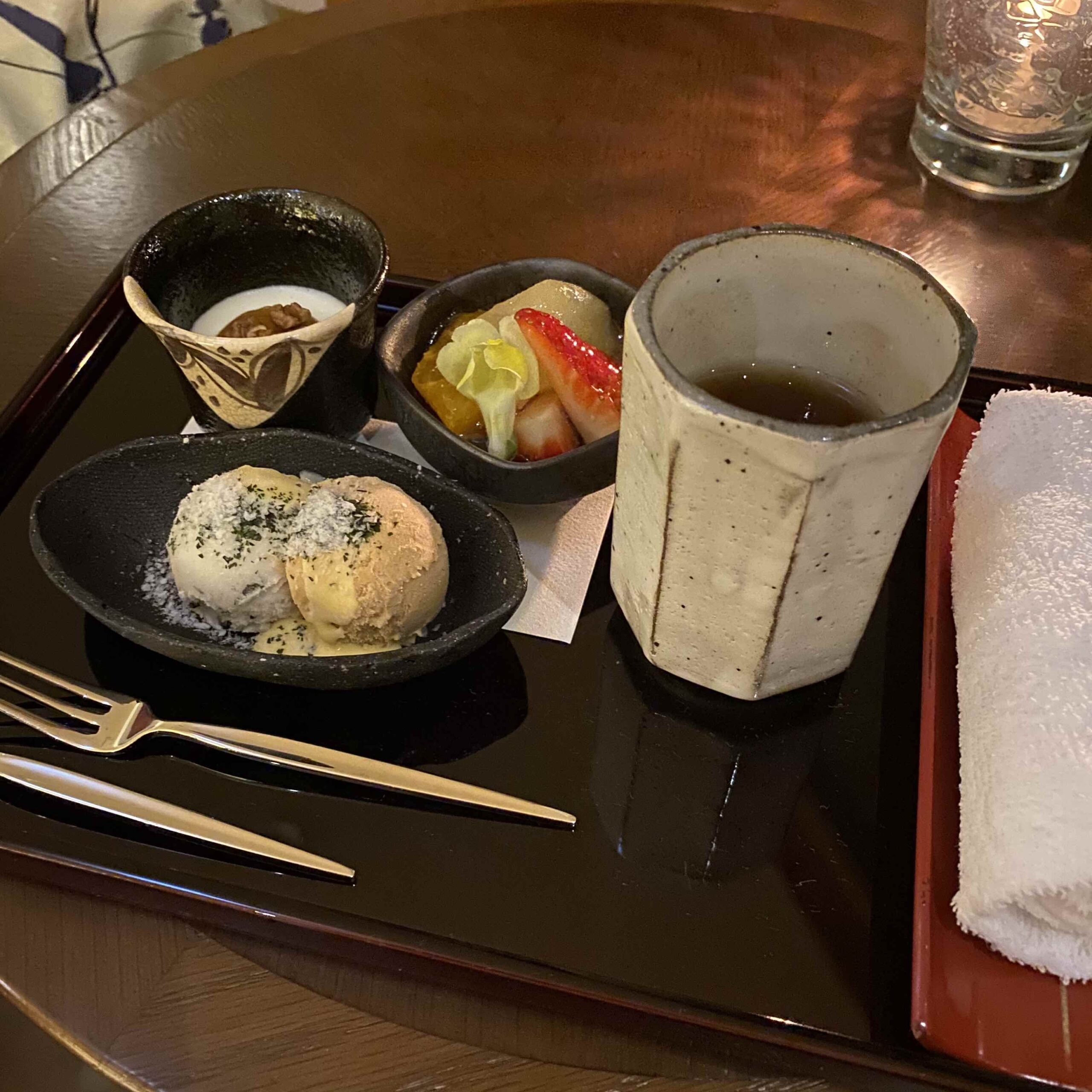 デザートはフルーツ&黄粉と黒豆のアイス&この白いのはなんだったけか・・・←