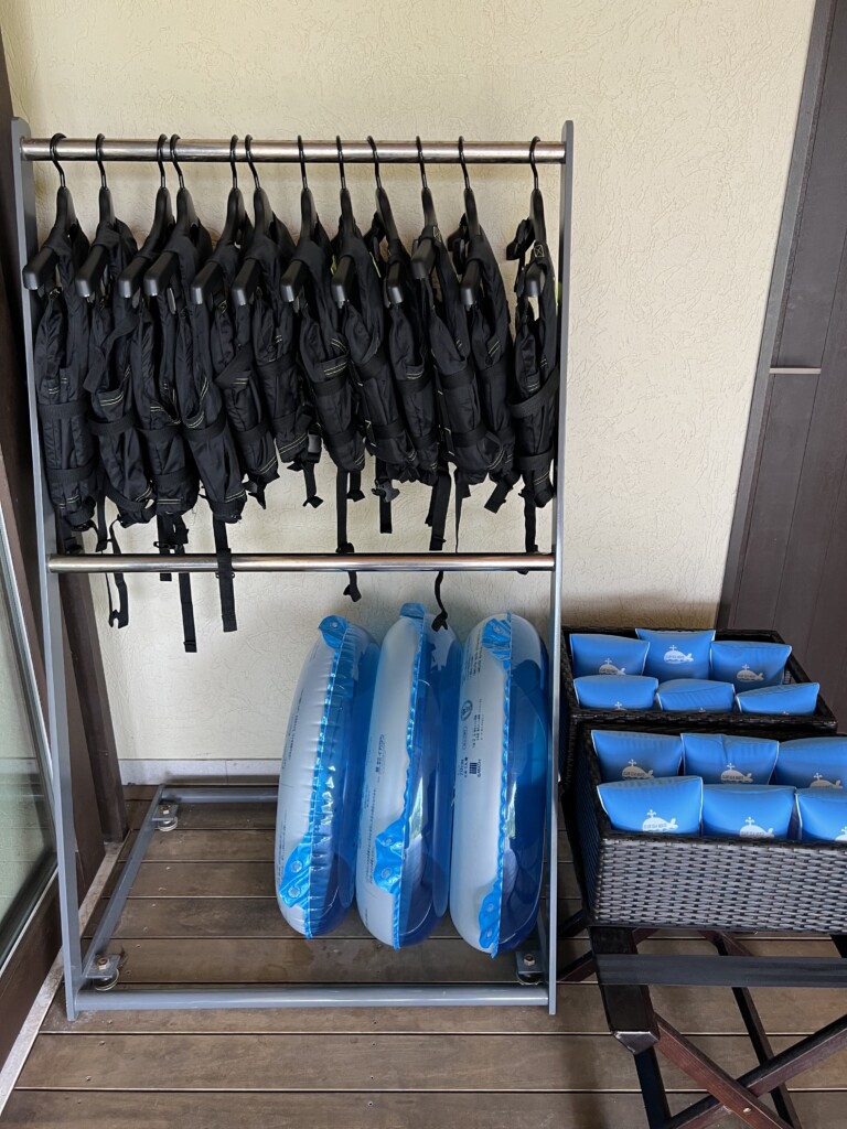 プールサイドには浮き輪やライフジャケットも。子ども用の腕浮き輪があるのも嬉しいです。