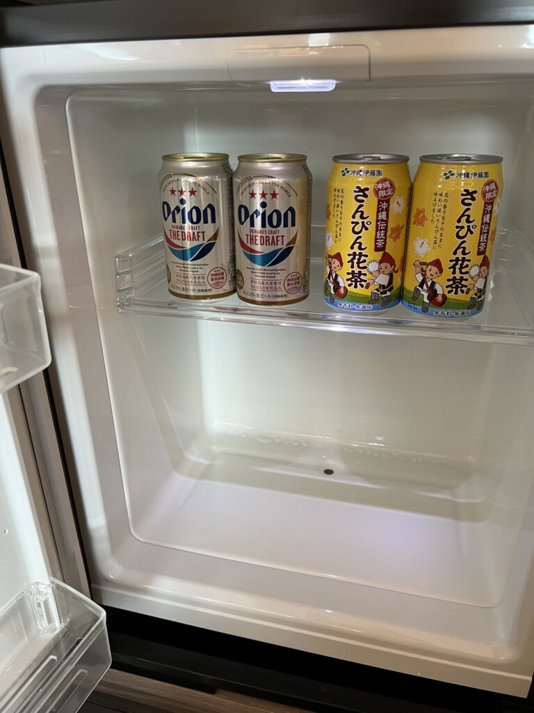 冷蔵庫の中にはオリオンビールとさんぴん茶が入っていました。沖縄っぽい!