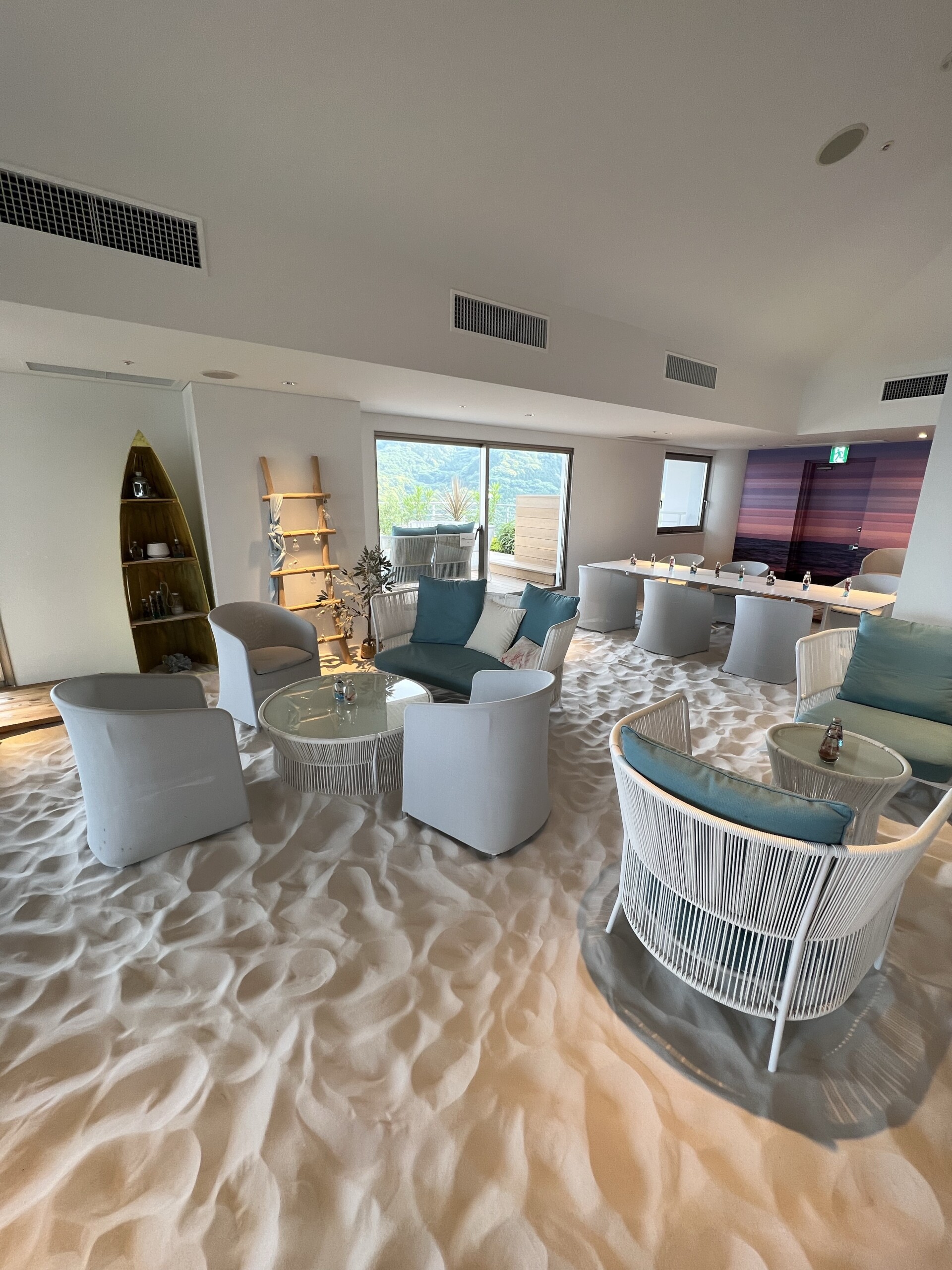 白砂が一面に敷き詰められた空間でのんびりケーキやカフェを楽しむことができます。