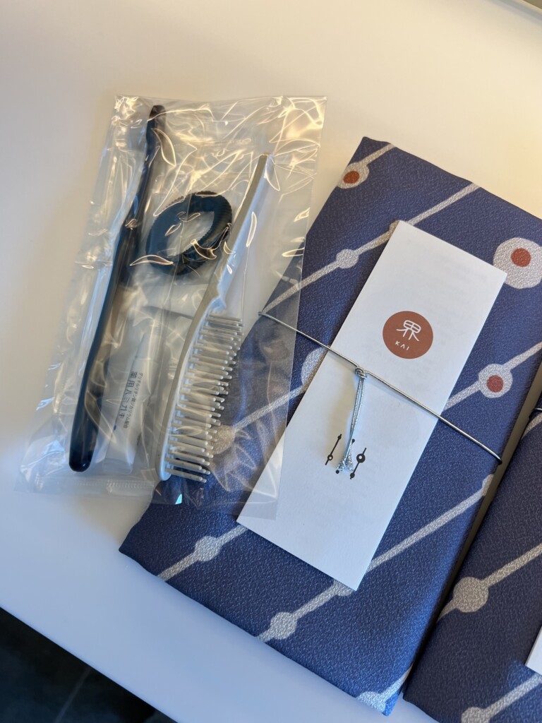いつもの界シリーズのアメニティ風呂敷。別府はきれいな藤色でした。