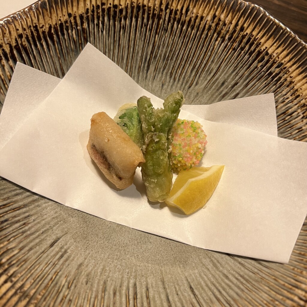 続いては揚げ物。白魚の四彩揚げ、甘鯛の桜花揚げ、野菜天ぷらをレモンでいただきます。