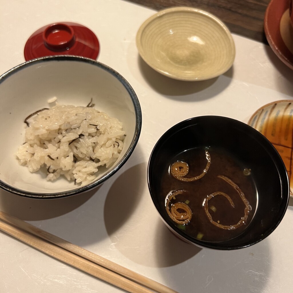 姫島ひじきと紫蘇の実の土鍋ごはん。留椀、香の物といただきます。