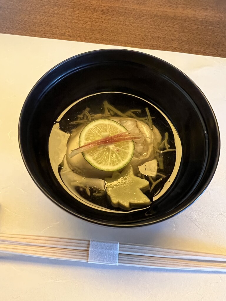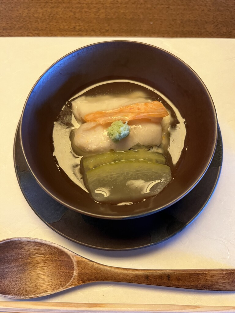 続いてこちらは煮物椀の、鱧真薯 青紅葉麩 順才 茗荷。