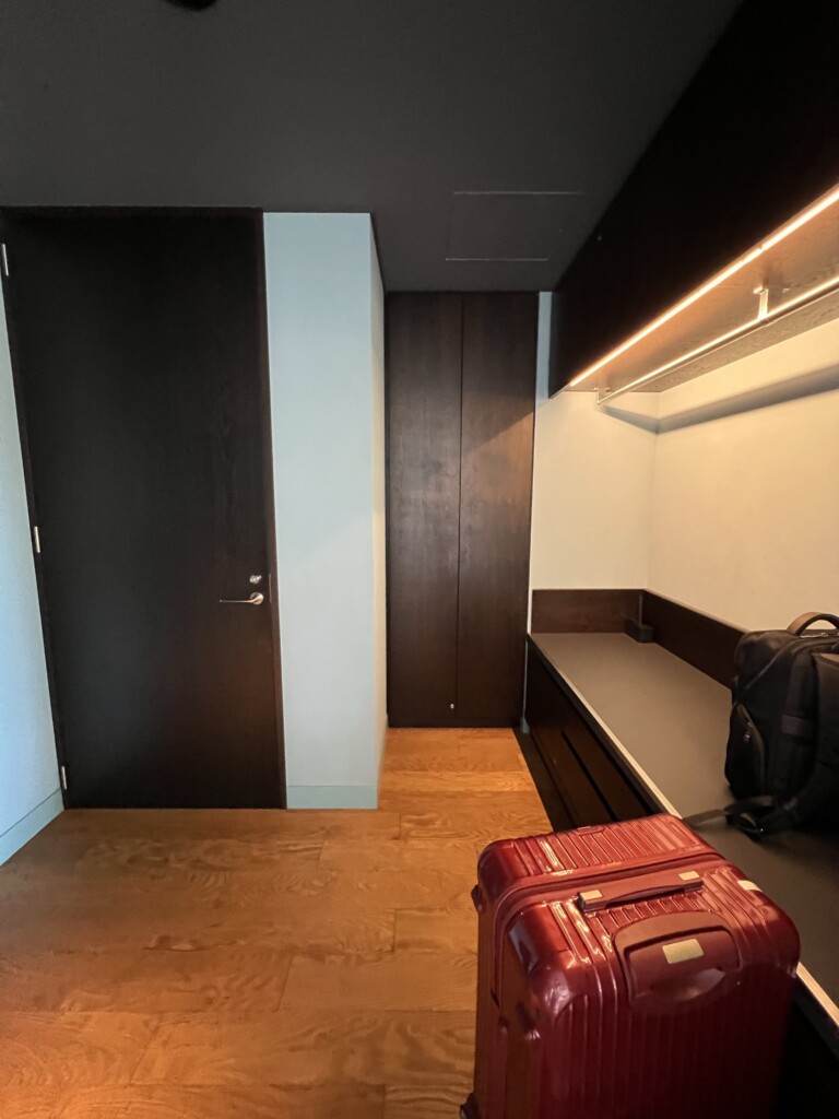 ベッドルームの左側に扉があり、そこを開けるとクローゼットスペース、トイレ、バスルーム等があります。