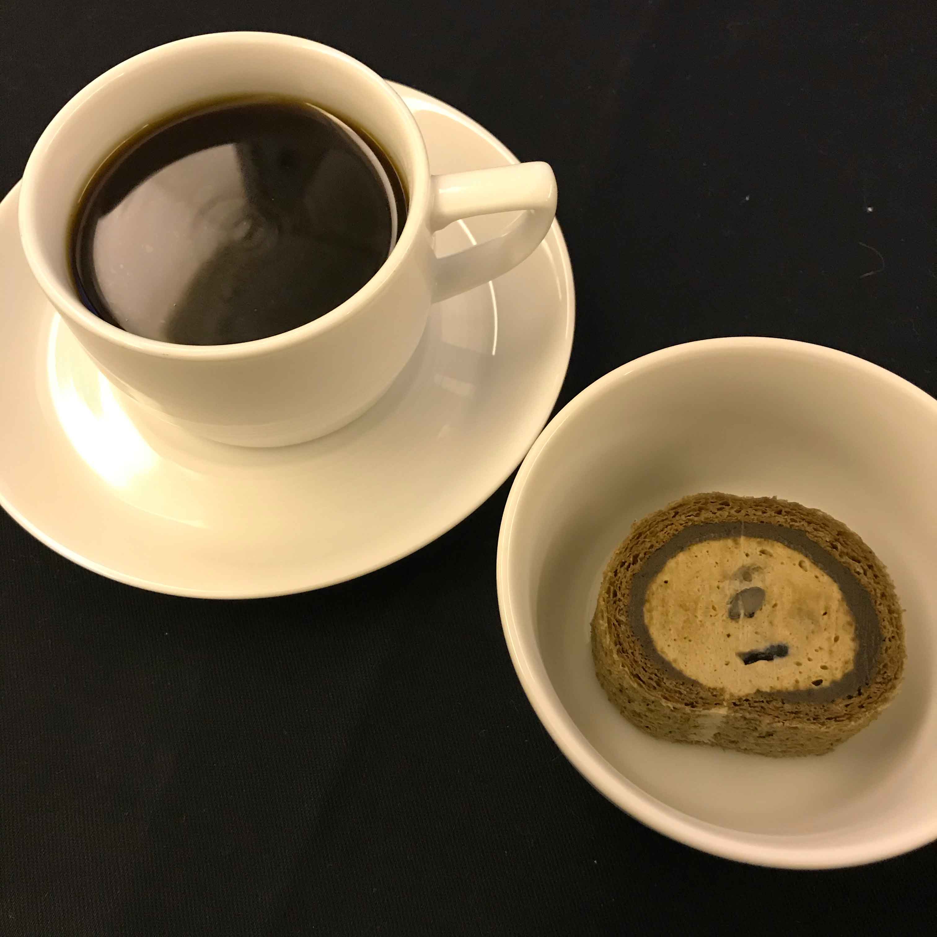 食後はコーヒーとほうじ茶ロールケーキ。