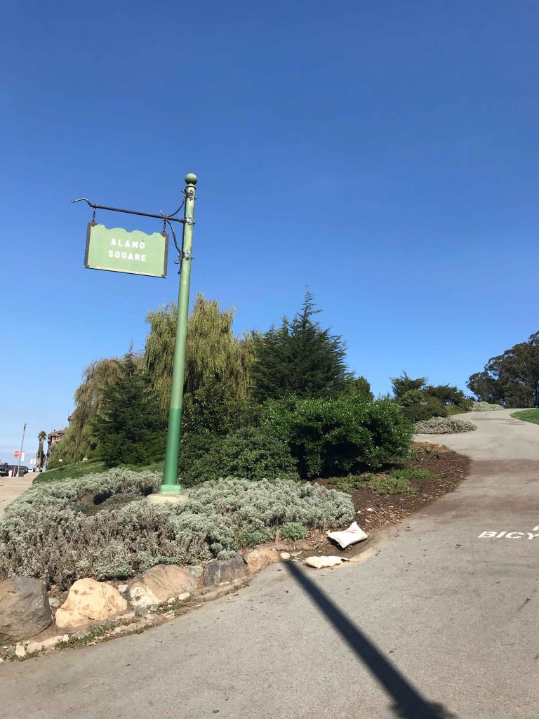 ペインテッド・レディースと反対側の方に丘を降りていくとアラモスクエアの看板がありました。