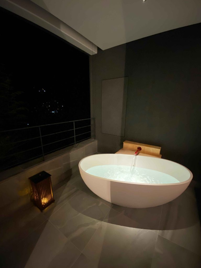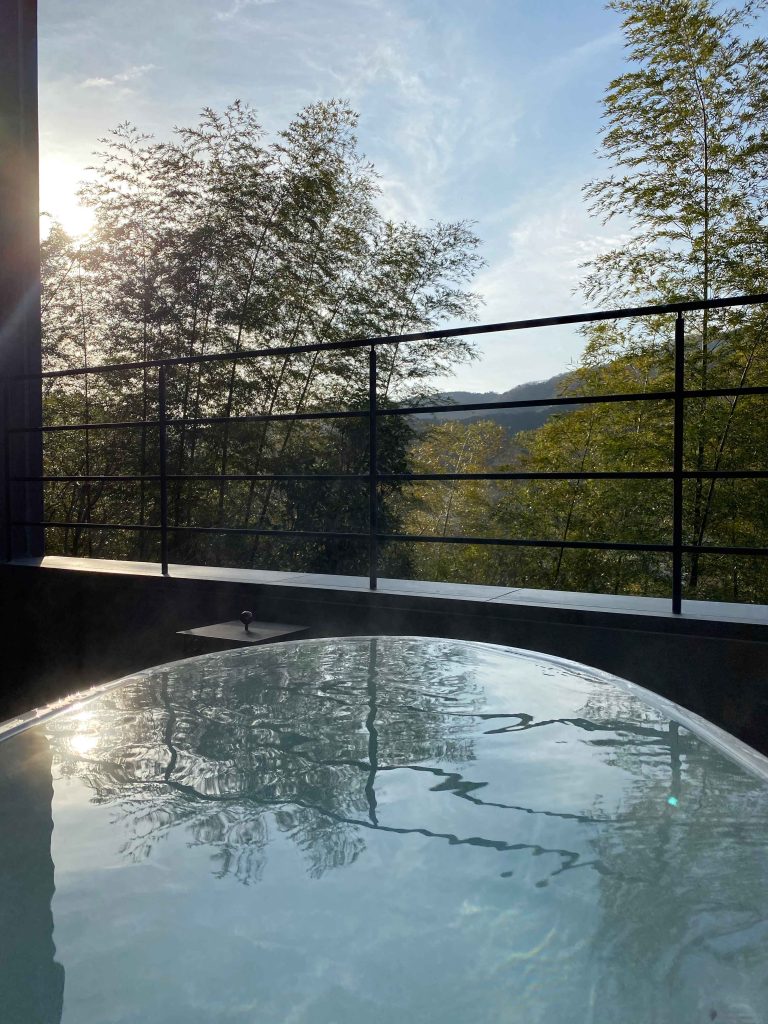 少々浴槽は狭めでしたが、森の風景を見ながらのプライベートな温泉はやはり格別に癒やされます。