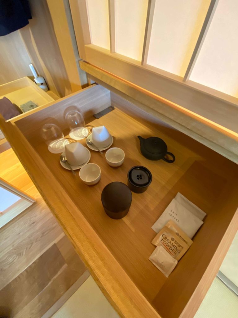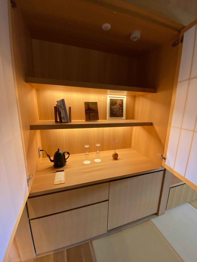奥のふすまのようなところが扉になっており、開けるとお茶セットがでてきます。